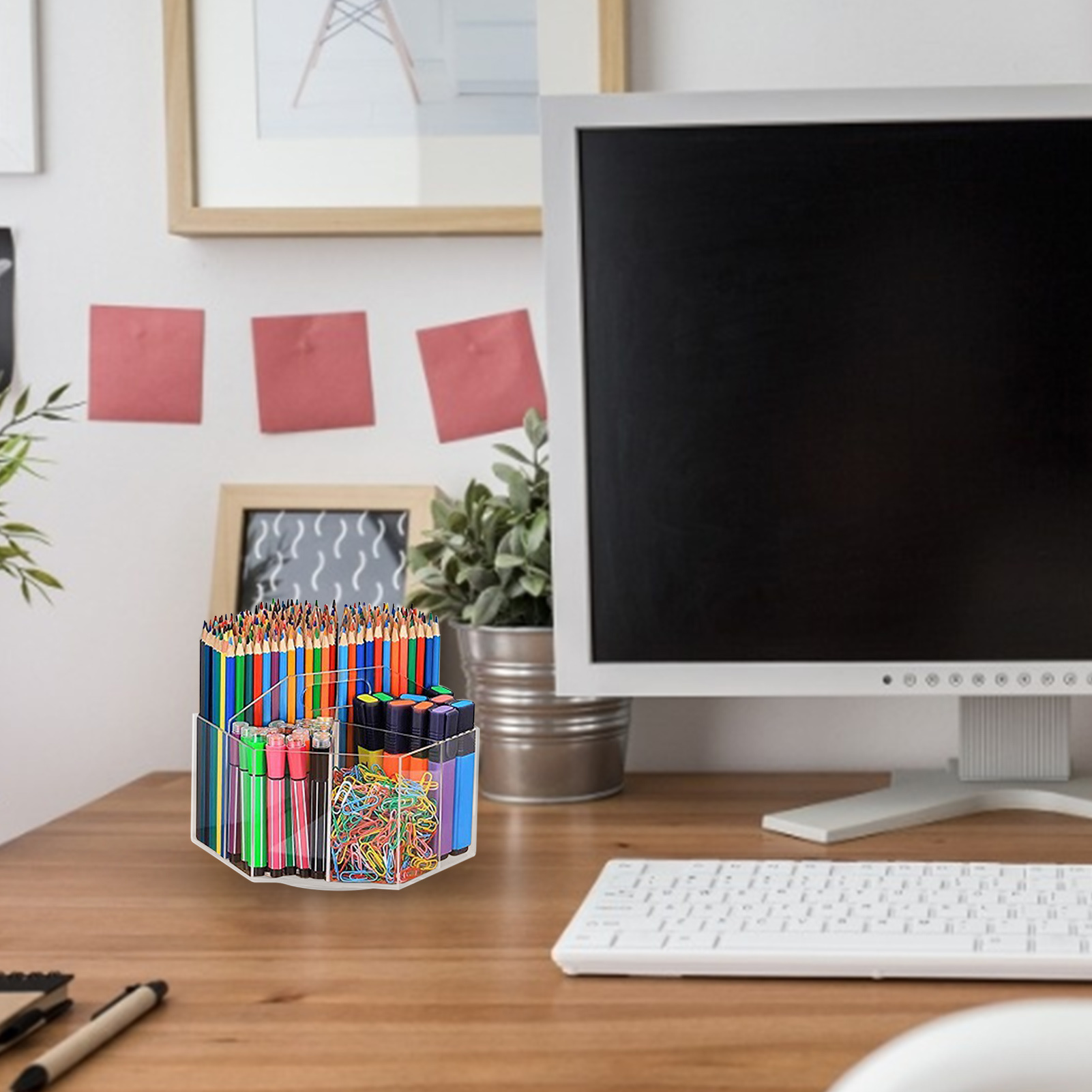 2, Large Capacity: This art holder is designed in a hexagonal shape with 6 storage compartments for easy separation and storage of pencils, pens, highlighters, markers, scissors, staplers, folders, etc.