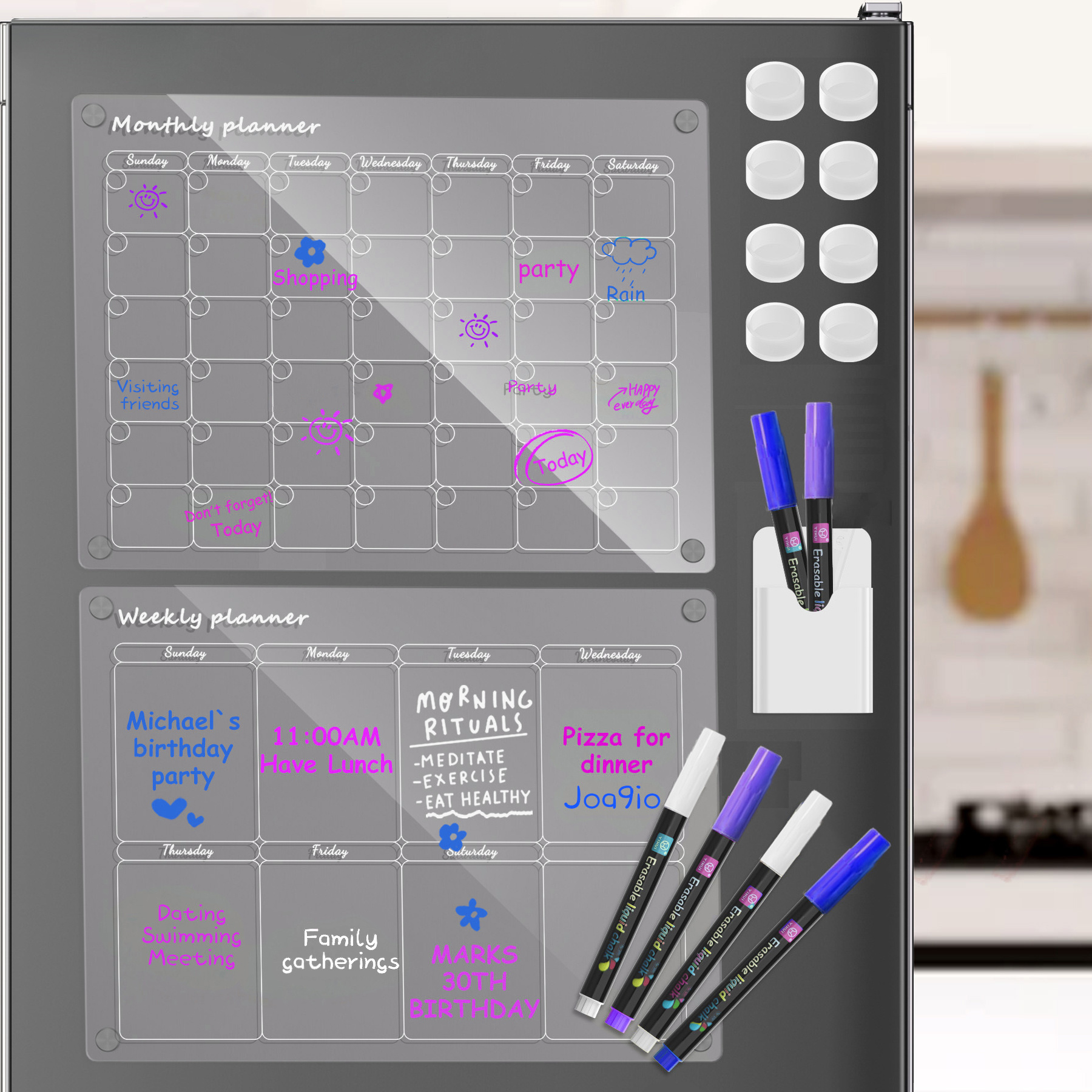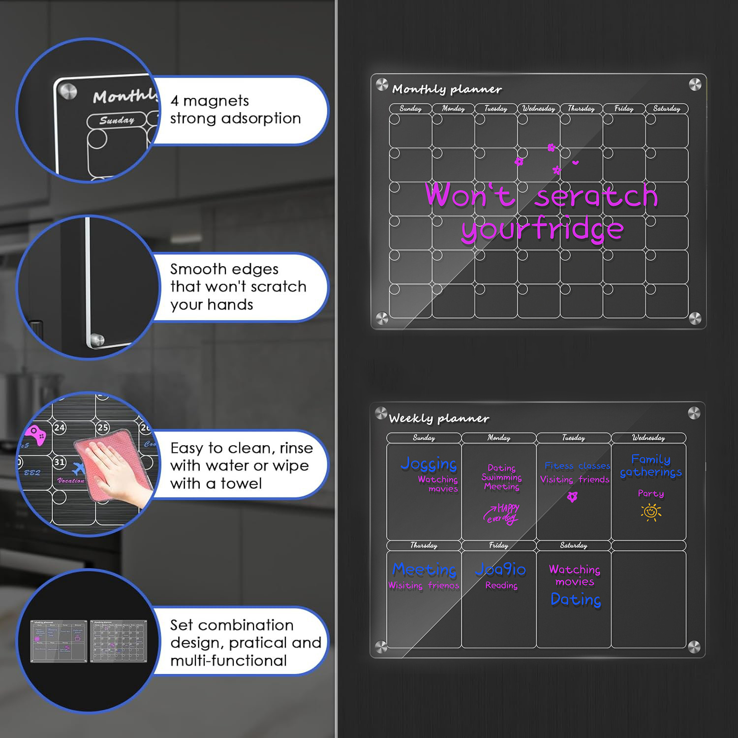 EASY TO WRITE AND CLEAN: Our acrylic refrigerator calendar features an ultra-smooth surface that enhances your writing experience.The 6-point, high-gloss markers make it easy to write down your plans and effortlessly erase them when it's time to start over. The clear acrylic calendar is scratch- and smudge-resistant and stays intact for repeated use. Perfect for kids to express themselves and doodle.