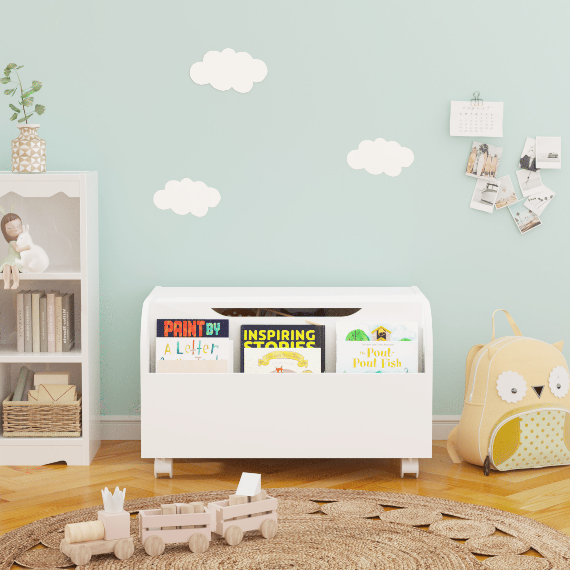 1.Multi-purpose: the toy box with front bookshelf is perfectly sized to hold all different type of books, toys, art accessories, and more.